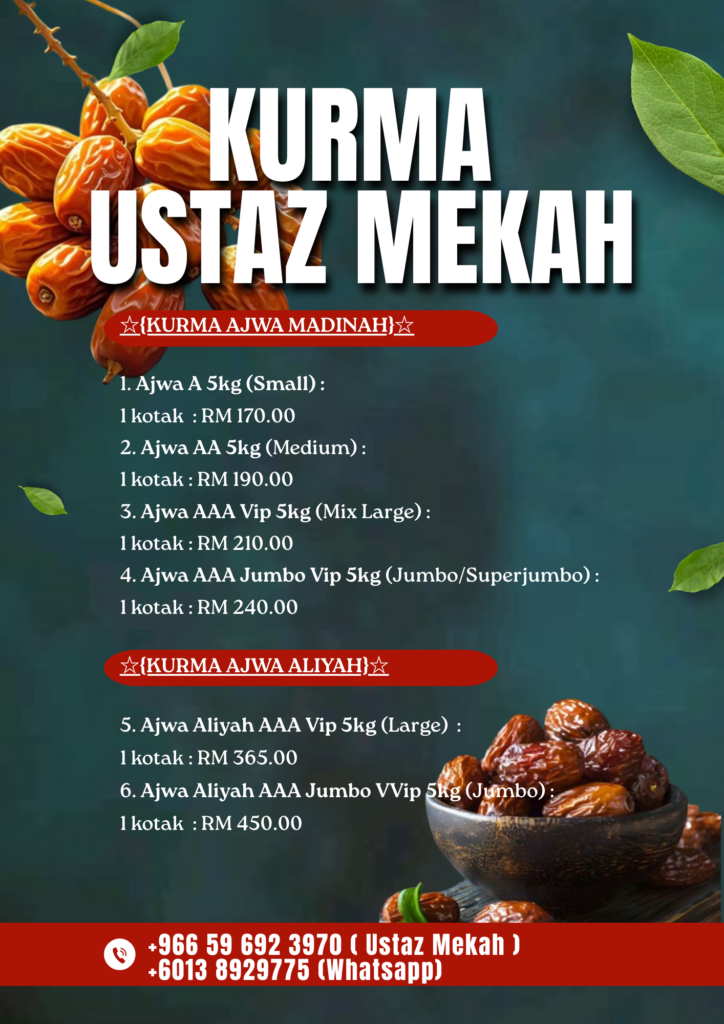 Kurma bukan sekadar makanan , tetapi makanan sunnah yang penut khasiat dan keberkatan, Jadikan Kurma Ustaz Mekah sebagai pilihan untuk keluarga dan perniagaan awak.